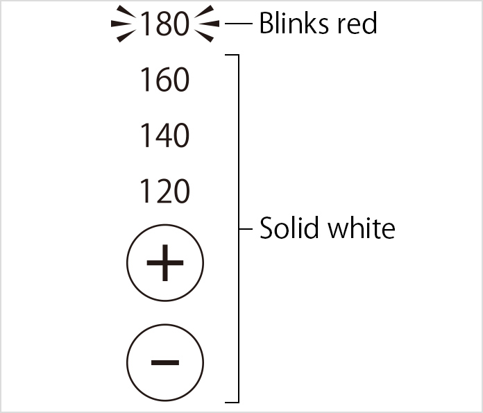 The temperature indicator in addition to the "+" and "-" indicators will display a solid white. The set temperature* display indicator will blink red.
