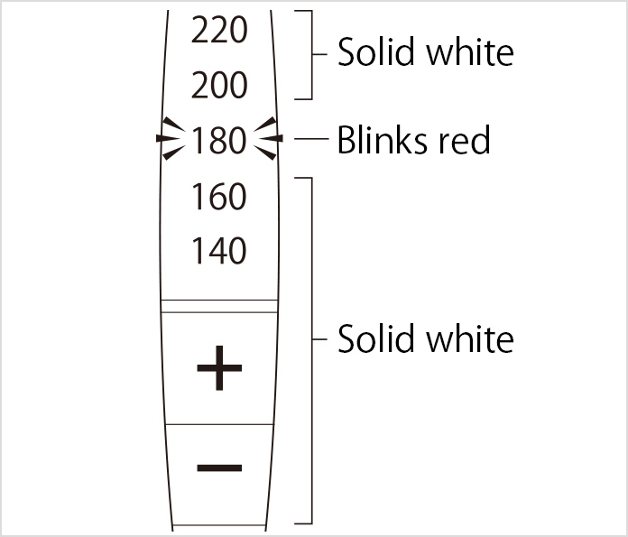 • The temperature indicator in addition to the "+" and "-" indicators will display a solid white. The set temperature* display indicator will blink red.