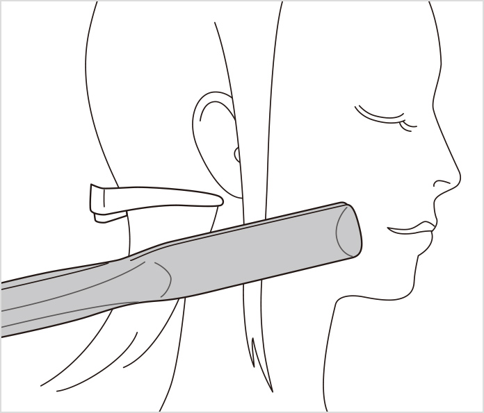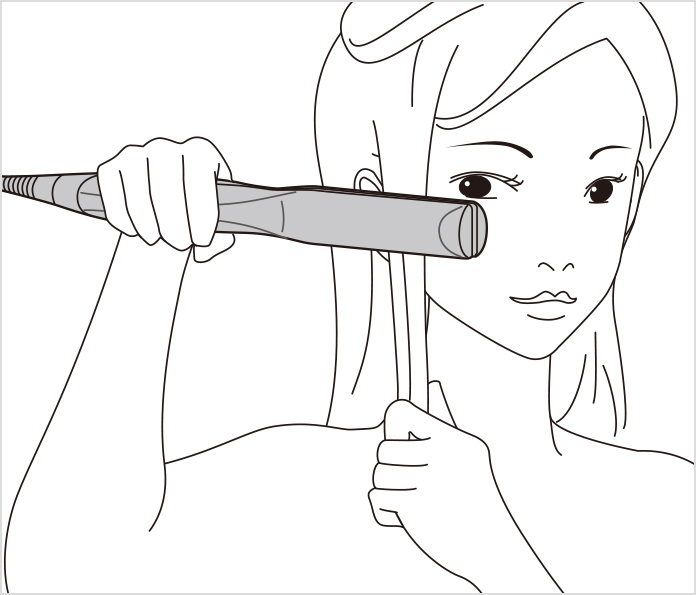 • (2) Slightly tilt the iron in the direction you want to curl your hair and place the section you want to curl between the iron plates.