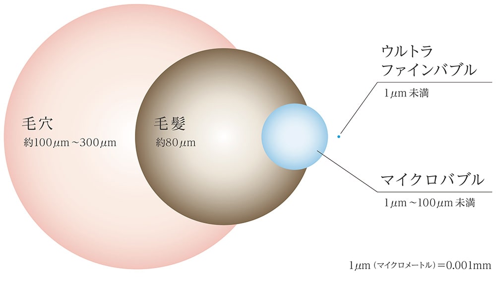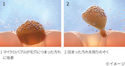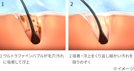 ウルトラファインバブルが毛穴の奥まで入り込んで汚れを取りのぞき、マイクロバブルが毛穴につまった大きな汚れを浮かせて取りのぞきます。
