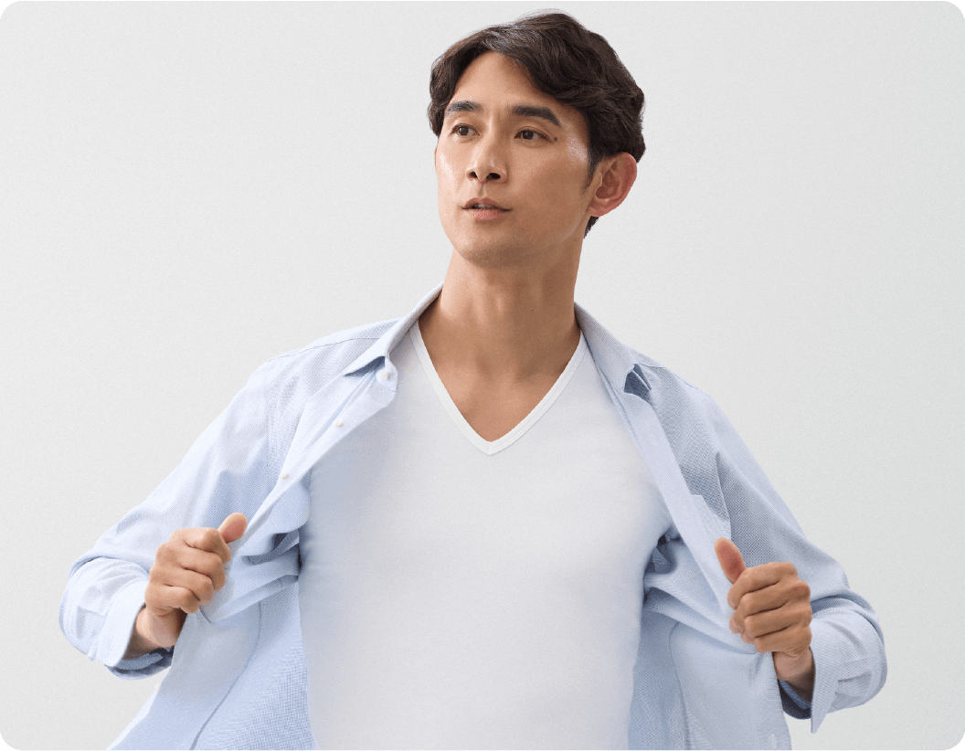 袖ぐりと背中側の生地にゆとりを持たせた設計で、シャツの下に着ても動きやすく、前かがみの姿勢でもストレスなく着用できます。