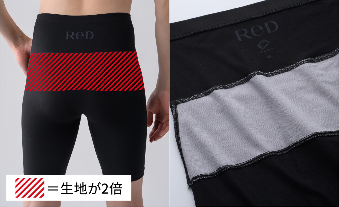 筋肉のこわばりにより血流が滞ることで、腰コリにつながります。そこで、腰の主要な筋肉へさらに密着できるよう、腰まわりの生地を二重に仕立てました。