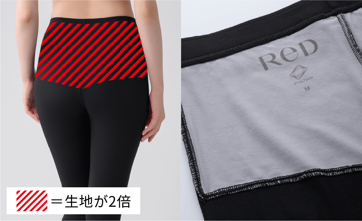 筋肉のこわばりにより血行が滞ることで、腰コリにつながります。そこで、腰の主要な筋肉へさらに密着できるよう、腰まわりの生地を二重に仕立てました。