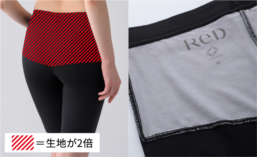筋肉のこわばりにより血流が滞ることで、腰コリにつながります。そこで、腰の主要な筋肉へさらに密着できるよう、腰まわりの生地を二重に仕立てました。