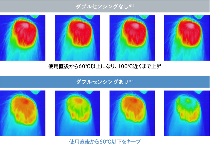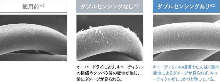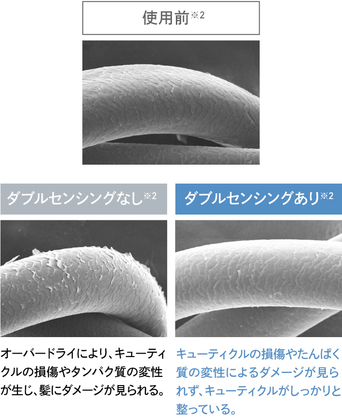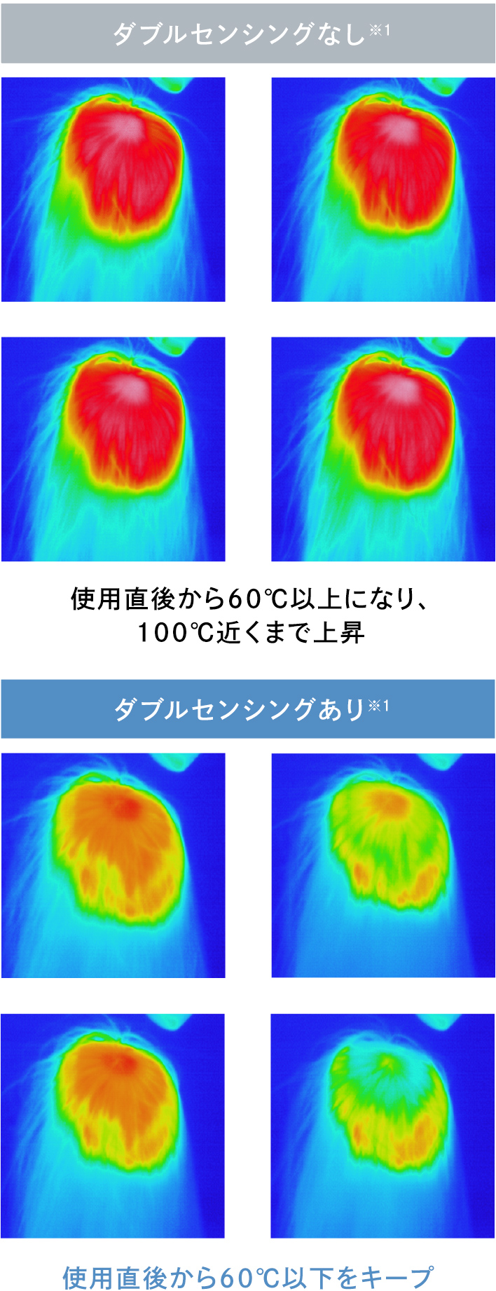 ダブルセンシングで髪の温度を見極め、過度な加熱を防ぐことで、