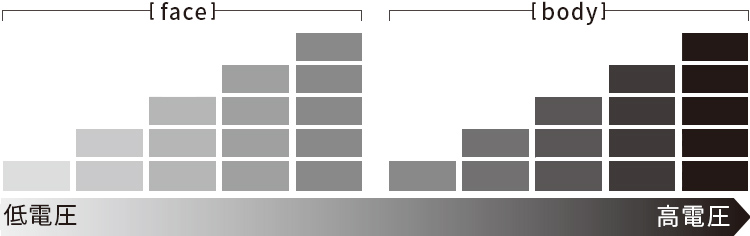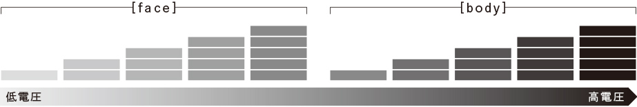 〈face/bodyモード〉はそれぞれEMS刺激を5段階で設定でき、好みに合った強さでのケアが可能です。
