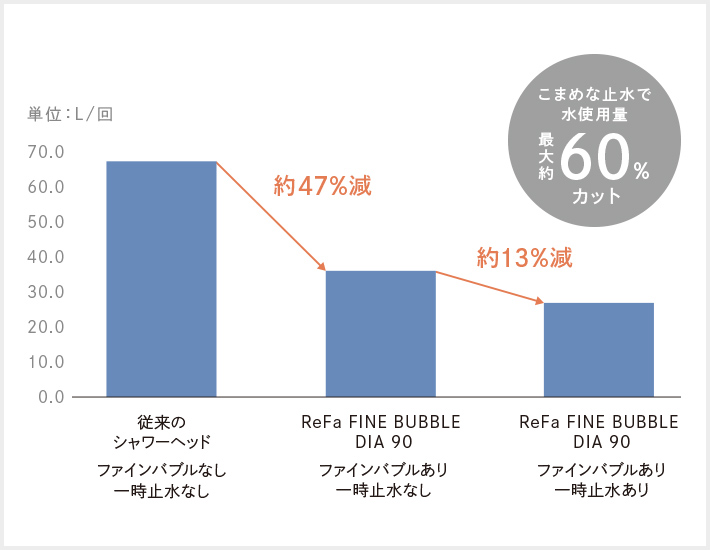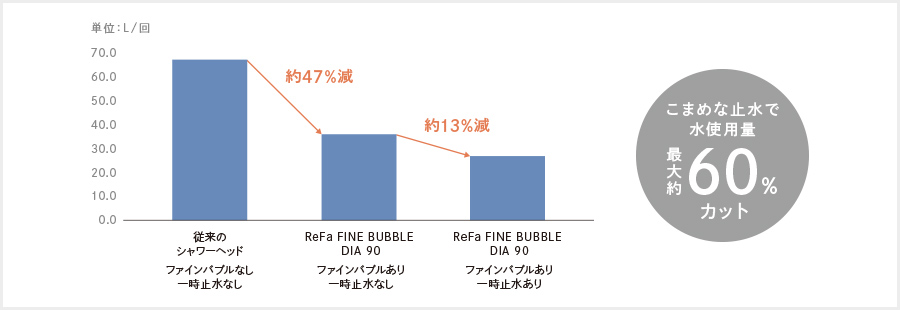 従来のシャワーヘッドに比べ、すべてのモードで節水効果が期待できます。