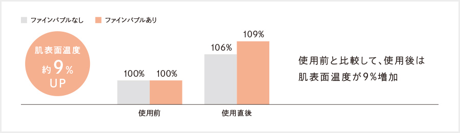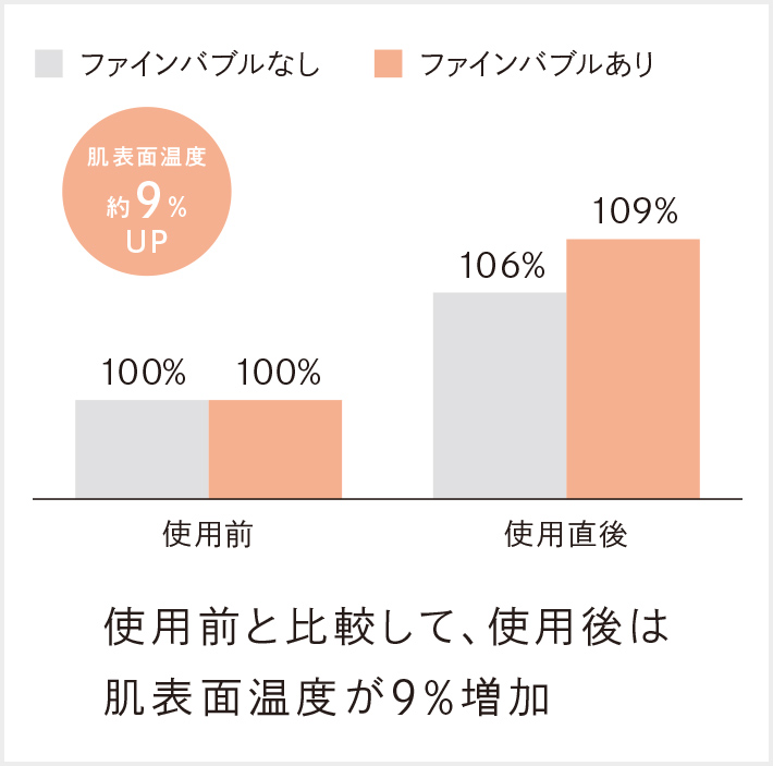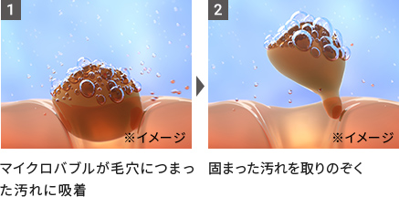 ウルトラファインバブルが毛穴の奥まで入り込んで汚れを取りのぞき、マイクロバブルが毛穴につまった大きな汚れを浮かせて取りのぞきます。