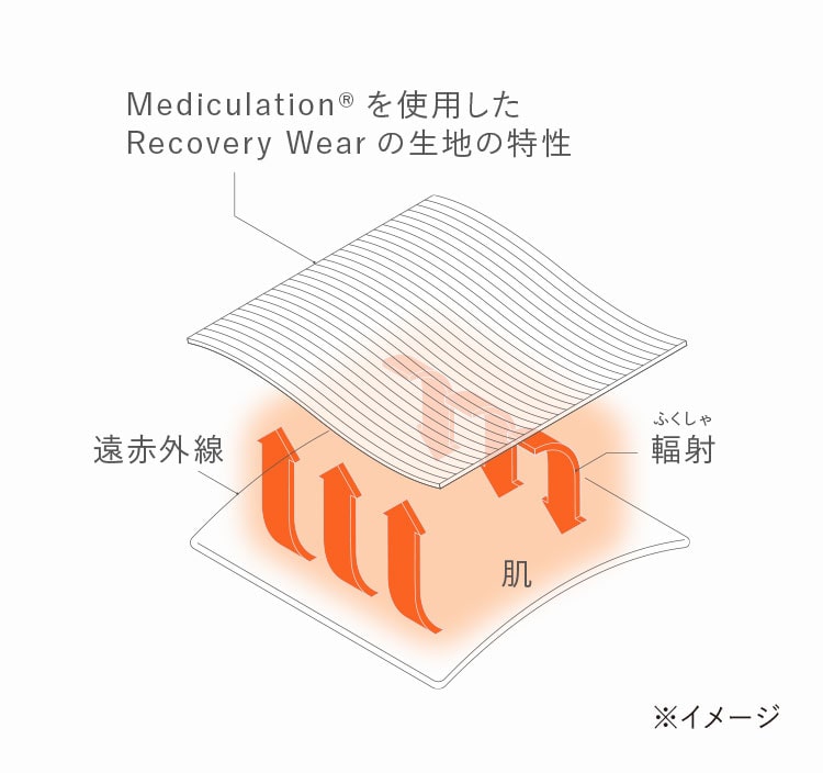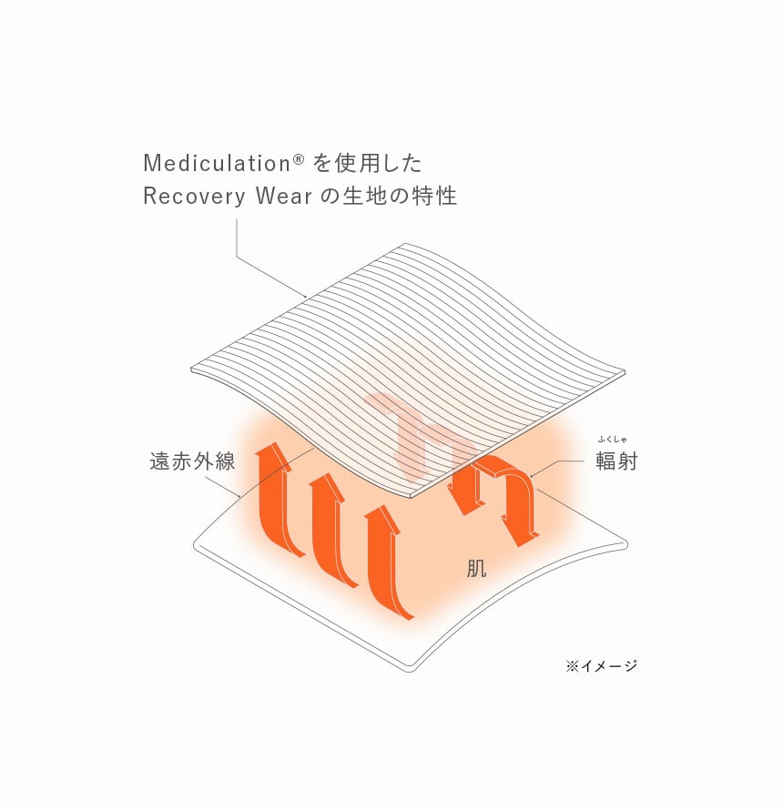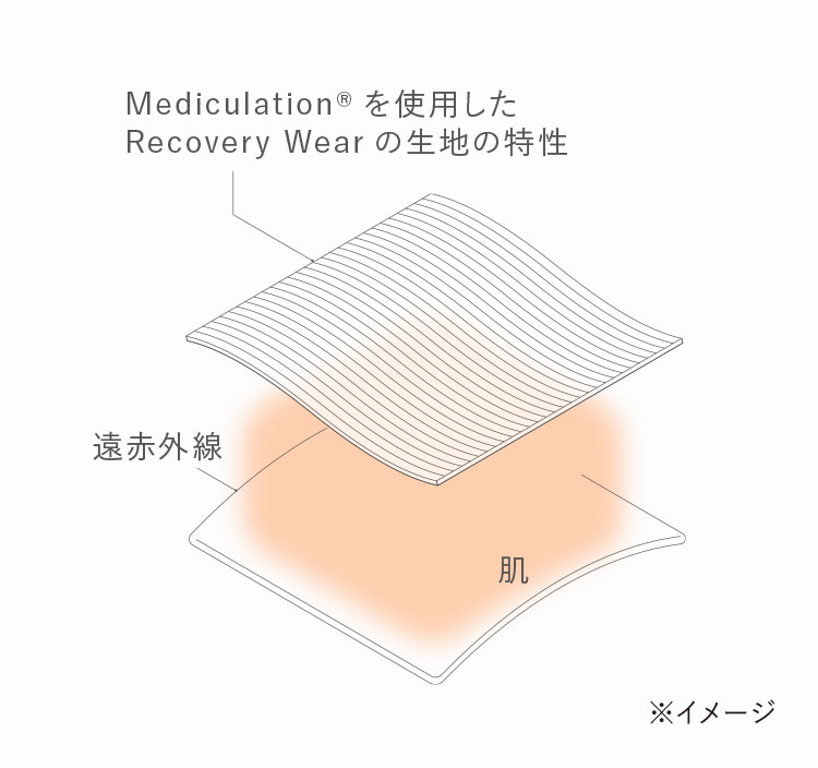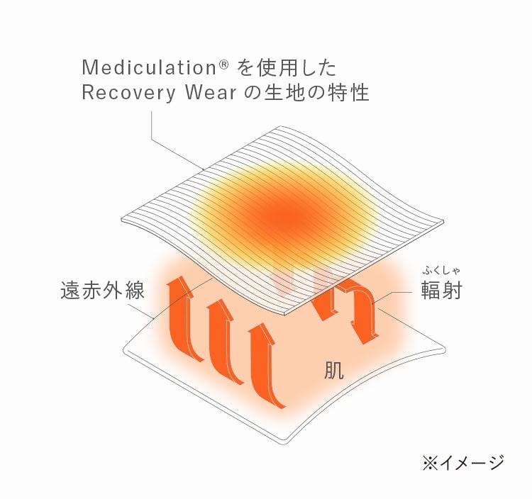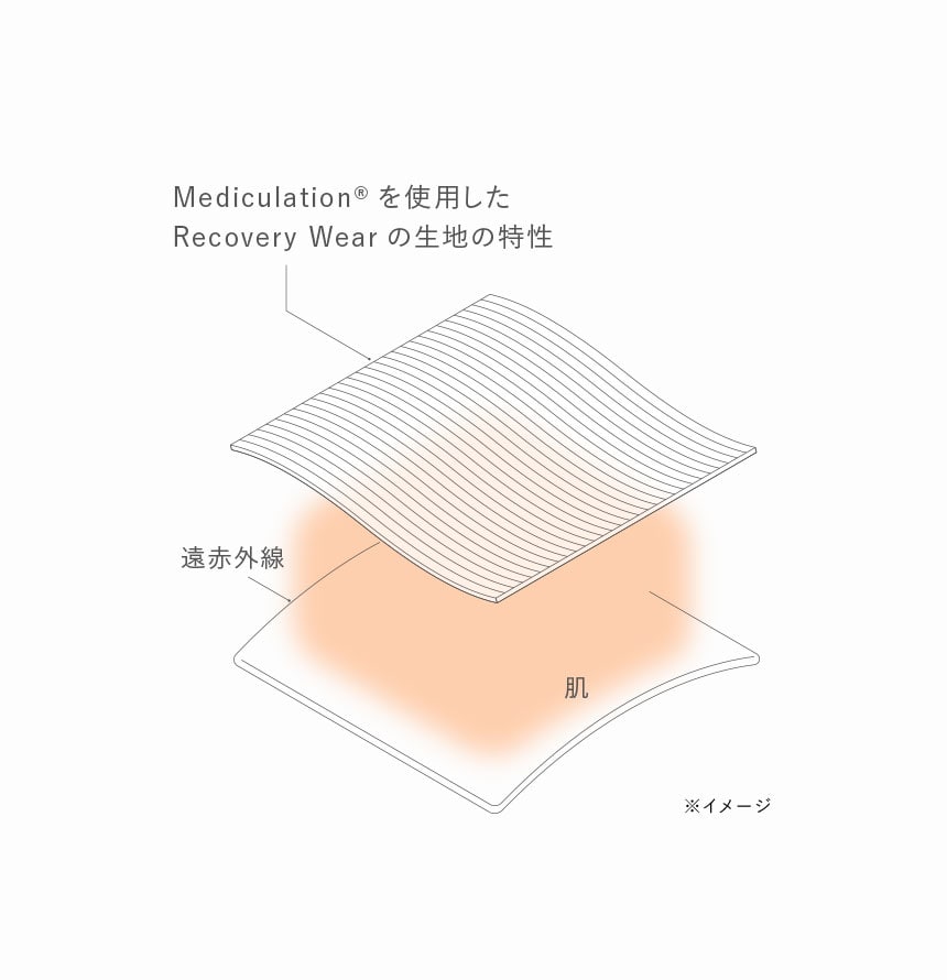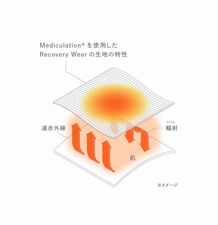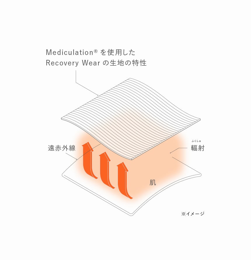 天然鉱石を原料とした高純度セラミック(非金属)を練り込んだ特殊繊維「Mediculation®(メディキュレーション)」が、身体から放出される遠赤外線(体温)を輻射することで血行を促進します。