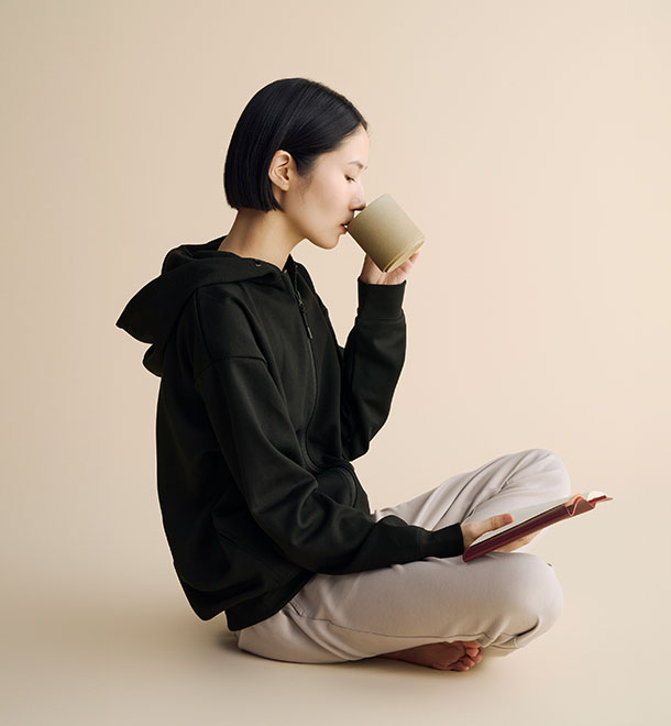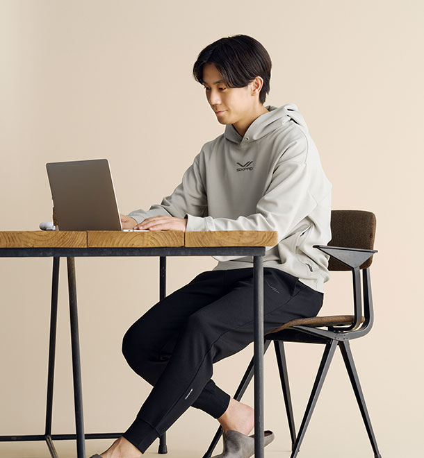 SIXPAD Recovery Wearシリーズは、体温を保ってくれるのでとても重宝しています。就寝中や部屋で過ごす時間、移動時間にも着用し、多い日は12時間着ていることもあります。
