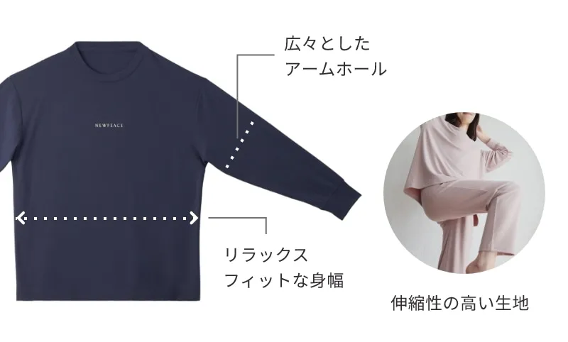 アームホールを広く、リラックスフィットな身幅のデザインを採用。また、伸縮性の高い生地により、寝返りのしやすさを実現しています。