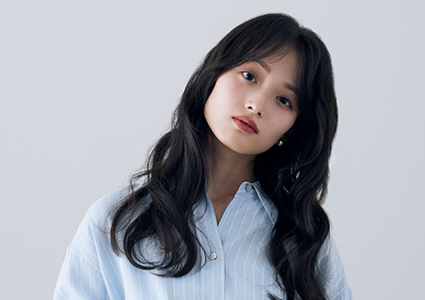 トレンドの女神風ヘアは、顔周りにくびれをつくるように大きくゆるめに巻いて完成。