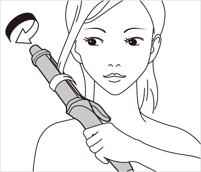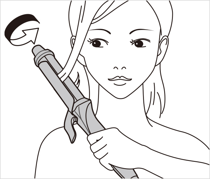 (2)クリップを外側にしてカールを付けたい位置をはさみます。巻きたい方向に本体を少し傾けて、アイロンパイプの中央に毛束をはさみます。