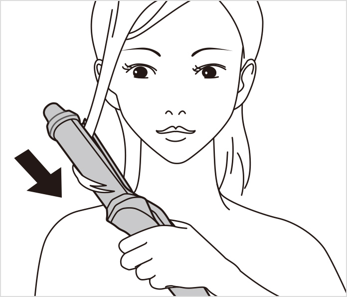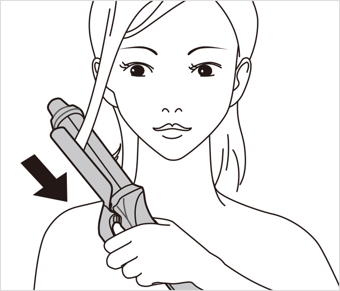 (2)クリップを内側にしてカールを付けたい位置をはさみます。巻きたい方向に本体を少し傾けて、アイロンパイプの中央に毛束をはさみます。