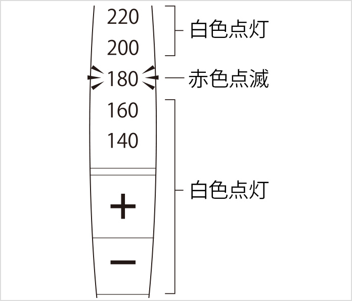 ※お買い上げ時の設定温度は180℃です。設定温度記憶機能により、2回目以降は前回の設定温度が赤色点滅します(電源オンのまま電源プラグをコンセントから抜いた場合は、設定温度が記憶されません)。