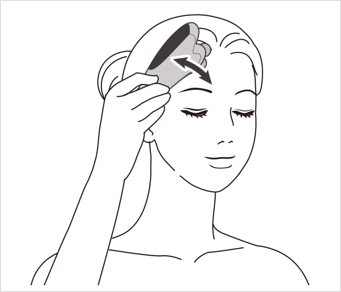 クレセントラインを額の半分にあて、斜め上に向かってすくい上げます。