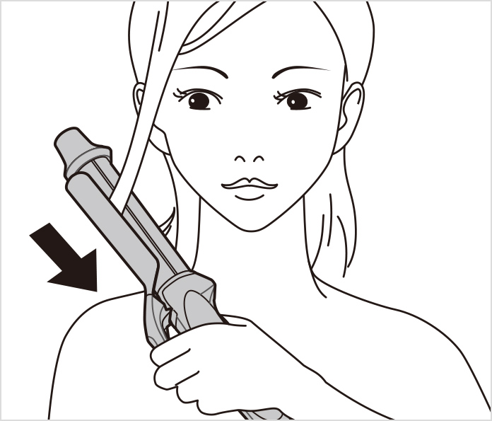 (2)クリップを外側にしてカールを付けたい位置をはさみます。巻きたい方向に本体を少し傾けて、アイロンパイプの中央に毛束をはさみます。