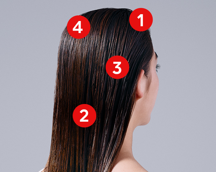 参考图示位置,分4部分吹干头皮。
