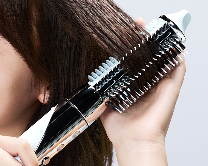 安装CURL BRUSH风嘴,并将其插入头发内侧。梳起发束,并将梳齿切实插入发丝中后,从发根至发梢吹整,打造自然卷发。