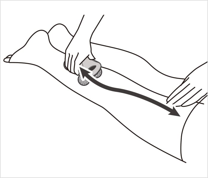 沿着脚踝至膝盖后侧滚动按摩小腿肚。